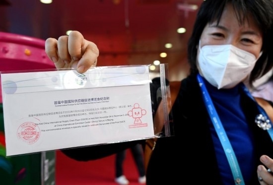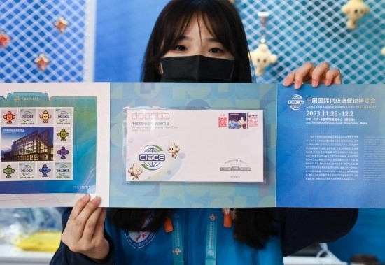 11月29日,一名觀展者在自己購買的鏈博會(huì)紀(jì)念郵封上加蓋了帶有“鏈氪”形象的紀(jì)念郵戳。