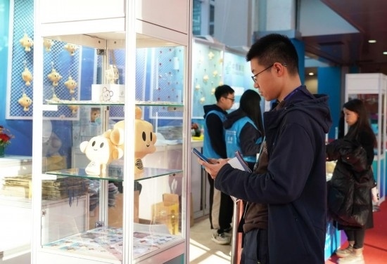 11月29日,在鏈博會(huì)文創(chuàng)小店的柜臺(tái)上放置著“鏈氪”形象的文創(chuàng)用品供觀展者選購。
