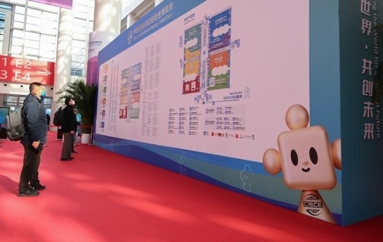 11月29日,鏈博會(huì)會(huì)場入口處的地圖導(dǎo)引墻上印有吉祥物“鏈氪”的形象。