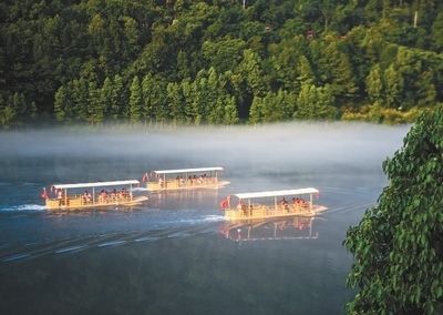 游客乘坐游船在新安江的江霧中前行。2012年浙皖兩省建立新安江流域生態(tài)補償機制試點,新安江成為全國跨區(qū)域生態(tài)文明治理樣板。山水相連、河湖相通、生態(tài)相依,三省一市持續(xù)探索跨界治水、流域共治,筑牢生態(tài)基底、推動綠色發(fā)展。新華社記者 徐 昱攝