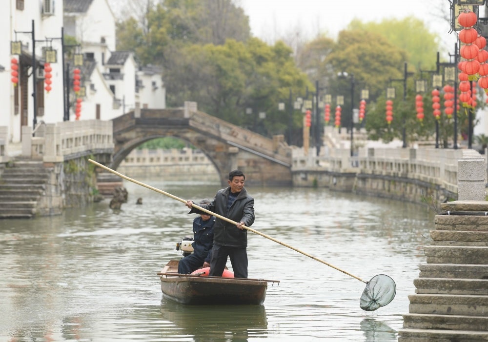 2023年3月16日,在太湖畔的浙江省湖州市織里鎮(zhèn)義皋村,保潔員在清理河道。多年來的溇港整治使得太湖周邊河道水質(zhì)明顯改善,也為鄉(xiāng)村旅游注入動力。新華社記者 翁忻旸 攝