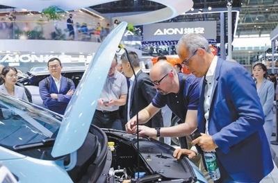 外國(guó)觀(guān)眾在北京車(chē)展廣汽埃安展臺(tái)參觀(guān)。王子牧攝