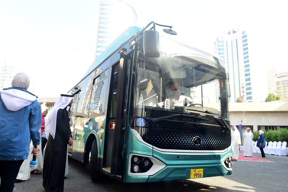 這是2022年12月21日在科威特首都科威特城拍攝的科威特首輛電動客車運營儀式上的電動金龍客車。新華社記者 尹炣 攝