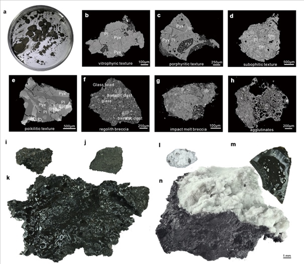 研究發(fā)現(xiàn),嫦娥六號(hào)采集的巖屑碎片主要由玄武巖、角礫巖、粘結(jié)巖、淺色巖石和玻璃質(zhì)物質(zhì)組成。其中,玄武巖碎片占總量的30%至40%,角礫巖和粘結(jié)巖由玄武巖碎屑、玻璃珠、玻璃碎片以及少量的斜長(zhǎng)巖和蘇長(zhǎng)巖等淺色巖石碎屑物質(zhì)構(gòu)成,進(jìn)一步揭示了樣品來源的復(fù)雜性。