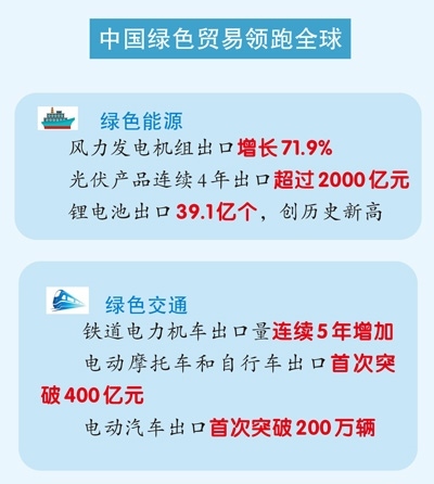 風(fēng)力發(fā)電機組出口增長超七成;光伏產(chǎn)品連續(xù)4年出口超2000億元;鋰電池出口創(chuàng)歷史新高……海關(guān)總署新聞發(fā)言人、統(tǒng)計分析司司長呂大良表示,2024年,中國綠色貿(mào)易領(lǐng)跑全球。中國綠色產(chǎn)品不僅豐富了全球供給,也為全球應(yīng)對氣候變化和綠色低碳轉(zhuǎn)型作出了巨大貢獻(xiàn)。