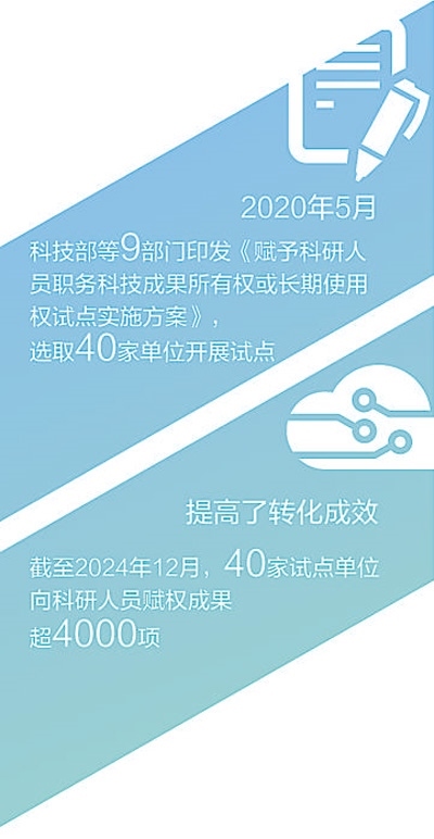 賦權(quán)試點實施以來,40家試點單位向科研人員賦權(quán)成果超4000項。2023年,以轉(zhuǎn)讓、許可、作價投資三種方式轉(zhuǎn)化科技成果合同金額達(dá)36.25億元,參與試點的科研人員普遍可獲科技成果轉(zhuǎn)化收益70%以上。僅2023年,試點單位對科研人員的現(xiàn)金股權(quán)獎勵就高達(dá)9.33億元。