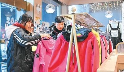 游客在湖北神農架林區(qū)木魚鎮(zhèn)一家店鋪挑選雪具雪服。