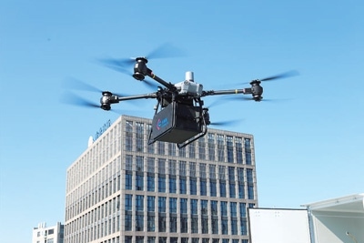 飛行在上海市北高新園區(qū)的載貨無(wú)人機(jī)。