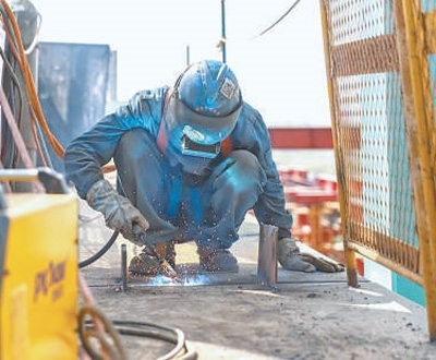“弓”臂湛藍(lán),“弓”弦平順。水面岸邊,兩座巨型橋墩供巨“弓”安臥。在簡(jiǎn)陽(yáng)沱江特大橋建設(shè)現(xiàn)場(chǎng),數(shù)十米高的橋面上,藍(lán)色主拱緩緩向前延伸。工人手持焊槍,藍(lán)光閃耀,焊花綻放。