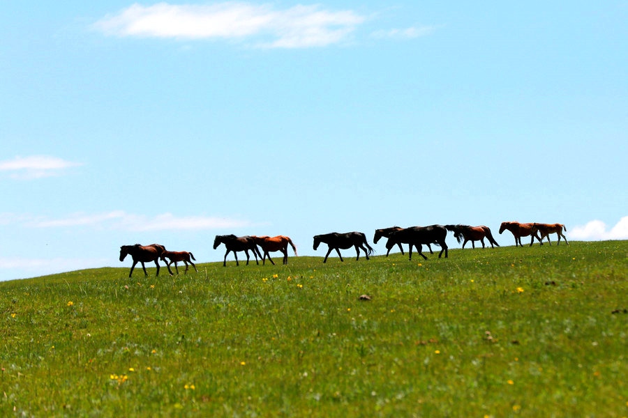 穿行在輝騰錫勒草原著名的黃花溝草原旅游區(qū),藍(lán)天白云、綠草如茵,鮮花朵朵、氈包座座,成群牛羊、牧歌回蕩……一幅優(yōu)美的草原風(fēng)情畫盡收眼底。