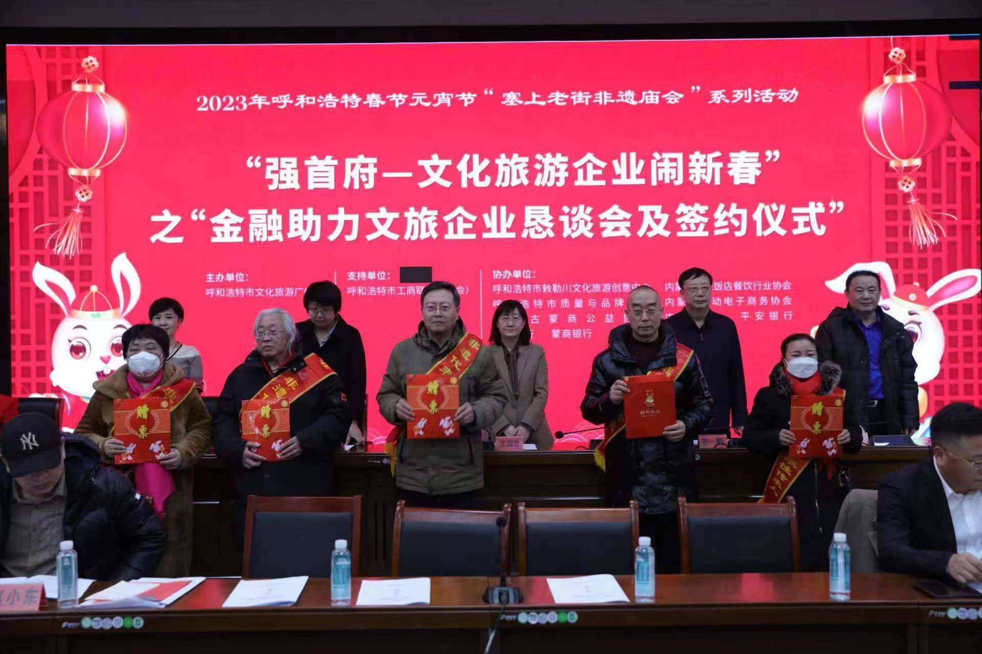本次活動(dòng)是“歡樂中國年,精彩敕勒川—2023年春節(jié)元宵節(jié)“塞上老街非遺廟會(huì)”系列活動(dòng)”的重要組成部分。首府地區(qū)80多家文化旅游企業(yè)參加了活動(dòng)。在活動(dòng)現(xiàn)場(chǎng),呼和浩特市文化旅游部門還為交警、城管、環(huán)衛(wèi)工人、非遺傳承人、少年兒童贈(zèng)送價(jià)值6萬元的呼和浩特地區(qū)的旅游景區(qū)門票。在現(xiàn)場(chǎng),5家銀行還設(shè)立“銀企合作咨詢臺(tái)”,現(xiàn)場(chǎng)與企業(yè)洽談對(duì)接,初步達(dá)成一些“金融支持文化旅游產(chǎn)業(yè)發(fā)展”的銀企合作意向。