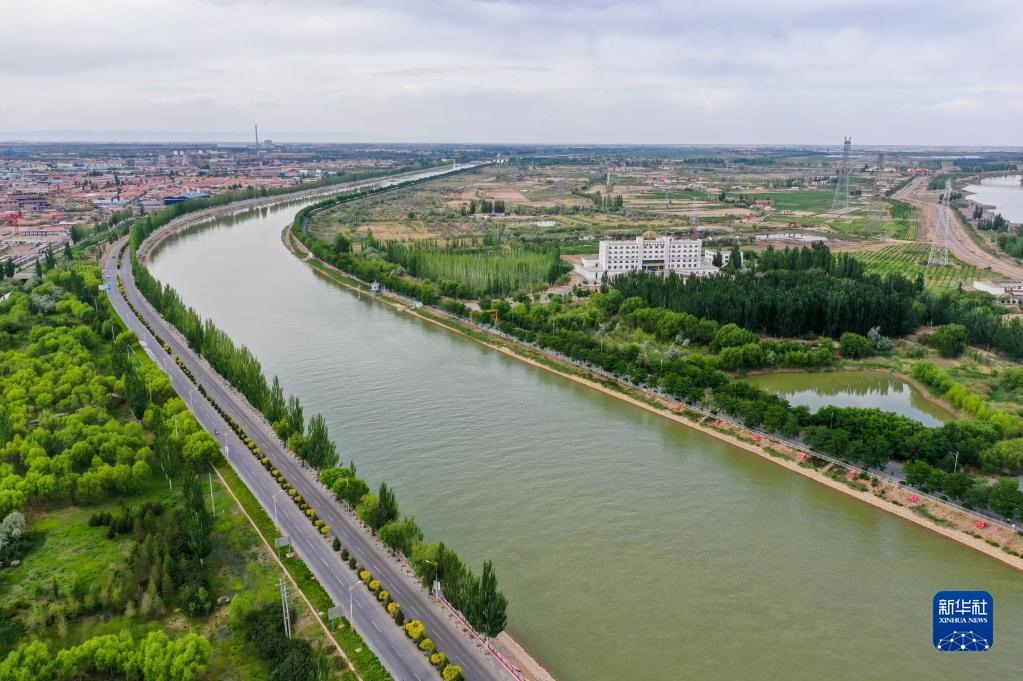 這是三盛公水利樞紐旁的黃河干渠(無人機(jī)照片,6月6日攝)。