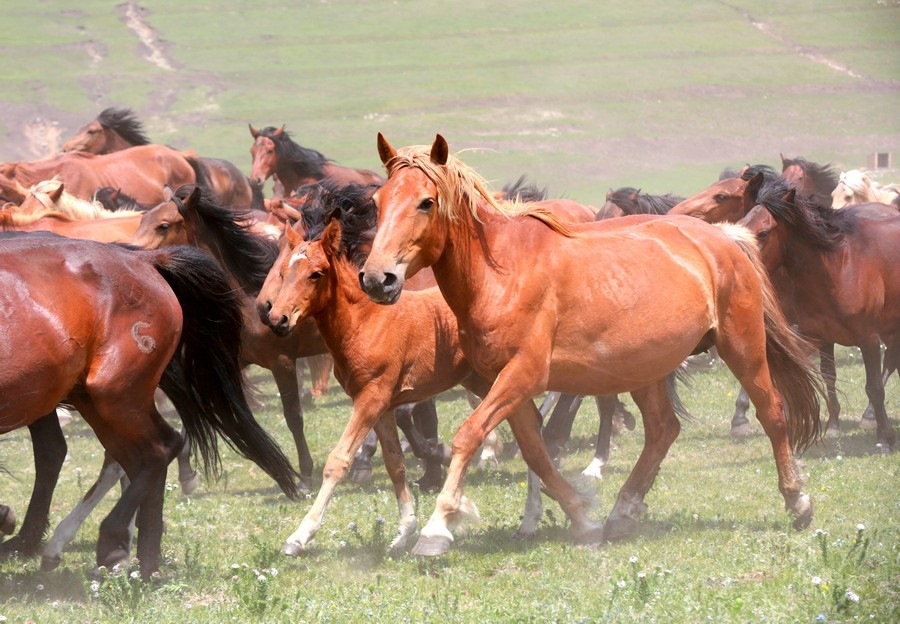 活動現(xiàn)場尤為引人注目的還有“萬馬奔騰”表演,只見騎手們頭纏彩巾,揚鞭策馬,他們身旁,近萬匹馬兒在騎手的驅(qū)趕下奔馳而來,馬蹄聲下草原上揚起陣陣沙塵,十分壯觀。