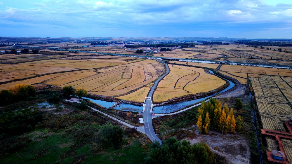 9月25日,空中俯瞰暮色中的三合村,遠(yuǎn)山如黛,稻田如畫(huà),金色的麥浪,映襯著豐收的底色。