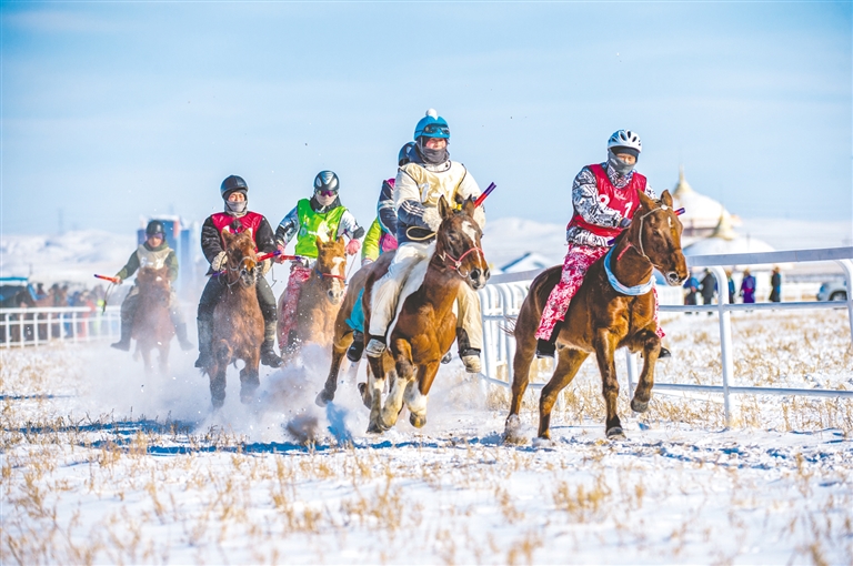 1月18日,錫林浩特市那達(dá)慕風(fēng)情園內(nèi)馬蹄踏雪、人聲鼎沸,“歌游內(nèi)蒙古·暢享錫林浩特”——冬季那達(dá)慕暨蒙古馬超級(jí)聯(lián)賽在歡騰的歌聲中拉開序幕。開幕式上,隨著馬蹄的噠噠聲,一支雄壯的馬隊(duì)踏雪而來,騎手們身著艷麗的蒙古袍,駕馭著矯健的蒙古馬,以整齊的隊(duì)列自遠(yuǎn)處緩緩走來。歌聲悠揚(yáng),舞姿豪邁,演員們以動(dòng)人的演繹,完美詮釋了力量與藝術(shù)之美。本次賽事包含15公里耐力賽、10公里3人團(tuán)體接力賽、跑馬射箭、跑馬拾哈達(dá)、6公里走馬及搏克比賽等比賽項(xiàng)目。賽場(chǎng)上,騎手們馭馬飛馳,人與馬默契配合,在銀裝素裹的雪原上縱橫馳騁。在跑馬射箭與跑馬拾哈達(dá)項(xiàng)目上,騎手在飛奔的馬匹上挽弓搭箭、俯身拾物,動(dòng)作行云流水,精湛技藝引來觀眾陣陣驚呼與贊嘆。除了扣人心弦的比賽,本次活動(dòng)還為游客打造了豐富的冰雪互動(dòng)體驗(yàn)。冰雪涮肉宴香氣四溢,草原篝火電音派對(duì)將熱情推向高潮,千人雪戰(zhàn)、雪地拔河等趣味項(xiàng)目讓游客親身參與,盡情享受冰雪樂趣。現(xiàn)場(chǎng)還同步舉辦了錫林浩特“伊德喜”草原冬儲(chǔ)肉展銷活動(dòng),讓游客在觀賽之余,還能選購(gòu)到正宗錫林郭勒牛羊肉,體驗(yàn)純正的草原風(fēng)味。(記者 巴依斯古楞 通訊員 崔巍光 攝影報(bào)道)