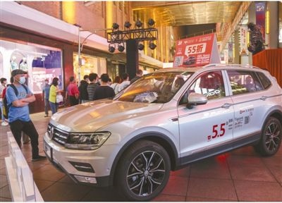 近日,上海南京路步行街上,不少商家采取“線上線下”聯(lián)動方式推出各類汽車促銷活動。圖為促銷活動現(xiàn)場。人民視覺
