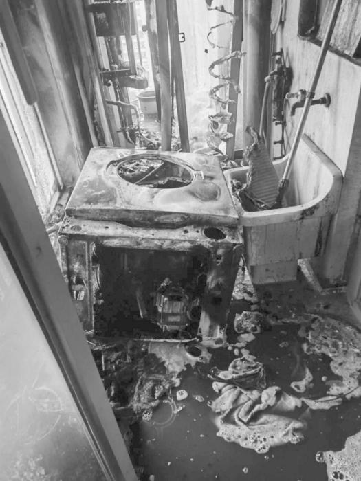 經(jīng)了解,起火點(diǎn)位于業(yè)主家的北陽(yáng)臺(tái),業(yè)主將吹風(fēng)機(jī)開機(jī)對(duì)著陽(yáng)臺(tái)水管吹了整整一夜,該吹風(fēng)機(jī)發(fā)生故障著火后引燃了堆積的雜物,洗衣機(jī)被燒得只剩下骨架,玻璃窗戶受熱后完全破碎,雜物悉數(shù)被燒,水管、墻面也被熏黑。