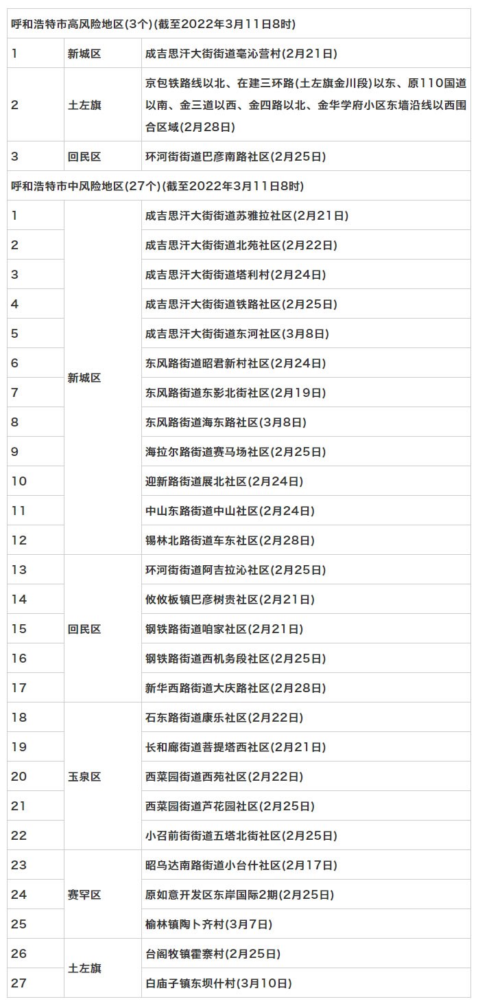按照國務院聯(lián)防聯(lián)控機制《關于調(diào)整新冠肺炎疫情分區(qū)分級標準實施精準管控措施的通知》規(guī)定,經(jīng)專家組評估,市指揮部研究決定,決定于3月11日8時起,將新城區(qū)保和少鎮(zhèn)野馬圖村,回民區(qū)環(huán)河街街道太平街社區(qū),玉泉區(qū)長和廊街道大召社區(qū)、小召前街街道建華北街社區(qū)調(diào)整為低風險地區(qū)。其他地區(qū)風險等級不變。