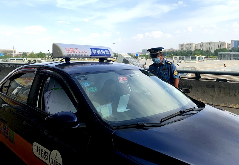 6月3日下午,呼和浩特白塔機(jī)場(chǎng),呼和浩特市交通運(yùn)輸綜合執(zhí)法支隊(duì)白塔機(jī)場(chǎng)中隊(duì)正在對(duì)機(jī)場(chǎng)接送客的出租車(chē)進(jìn)行檢查。