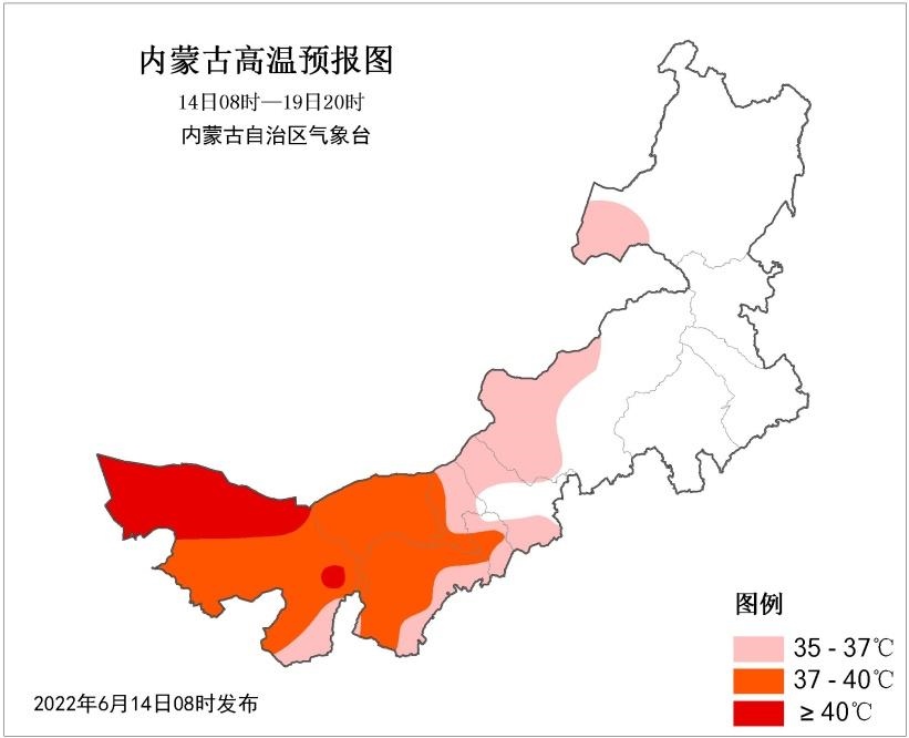據內蒙古氣象臺預計,6月16~20日連續(xù)5天,內蒙古西部及中部偏西大部地區(qū)(阿拉善盟、烏海市、巴彥淖爾市、鄂爾多斯市、包頭市、呼和浩特市等大部地區(qū))將迎來今年首次大范圍35℃以上高溫天氣,其中,西部部分地區(qū)最高氣溫將達37℃及以上,局地超過40℃;20~21日阿拉善盟高溫將逐漸減弱消失,而35℃以上高溫天氣向錫林郭勒盟西部延伸。