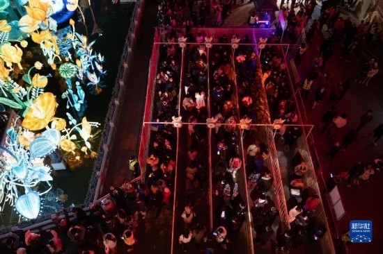 2月15日,市民和游客在上海豫園九曲橋賞燈。