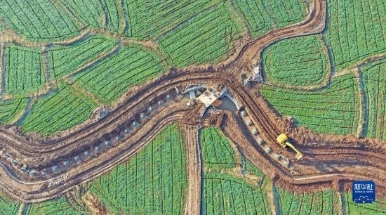 2月16日,在湖南省永州市道縣壽雁鎮(zhèn)芽洞村,工人駕駛挖掘機(jī)在高標(biāo)準(zhǔn)農(nóng)田建設(shè)項(xiàng)目現(xiàn)場施工(無人機(jī)照片)。