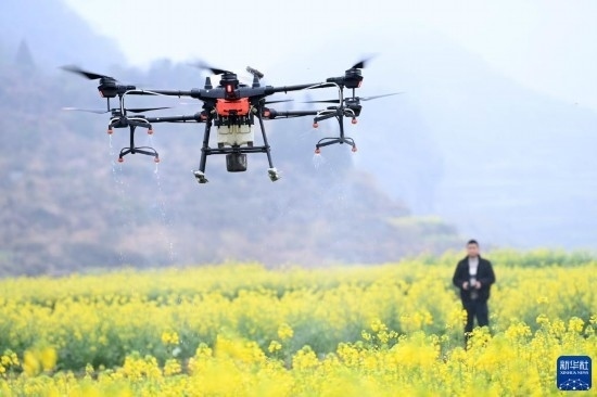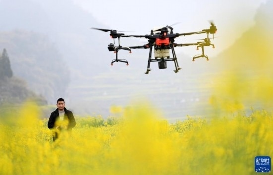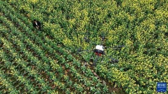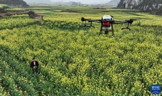 2月17日,在貴州省六盤水市六枝特區(qū)木崗鎮(zhèn)油菜基地,農(nóng)技人員利用植保無人機進(jìn)行春管。