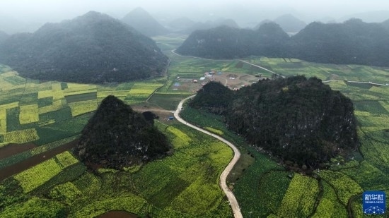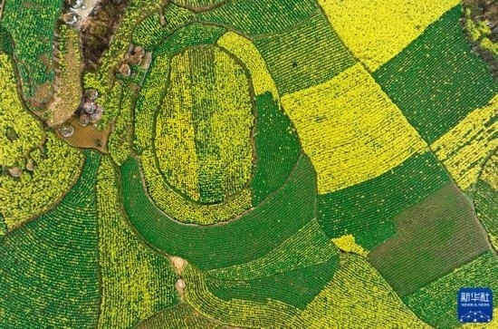 2月17日拍攝的貴州省六盤水市六枝特區(qū)木崗鎮(zhèn)萬畝油菜基地(無人機照片)。