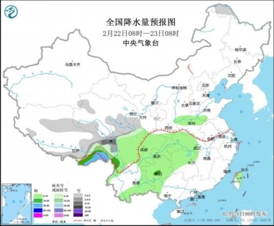 全國降水量預(yù)報圖(2月22日08時-23日08時)。圖片來源:中央氣象臺網(wǎng)站