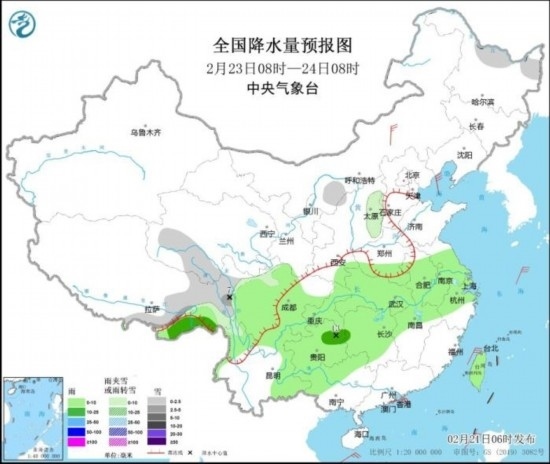 全國降水量預(yù)報圖(2月23日08時-24日08時)。圖片來源:中央氣象臺網(wǎng)站