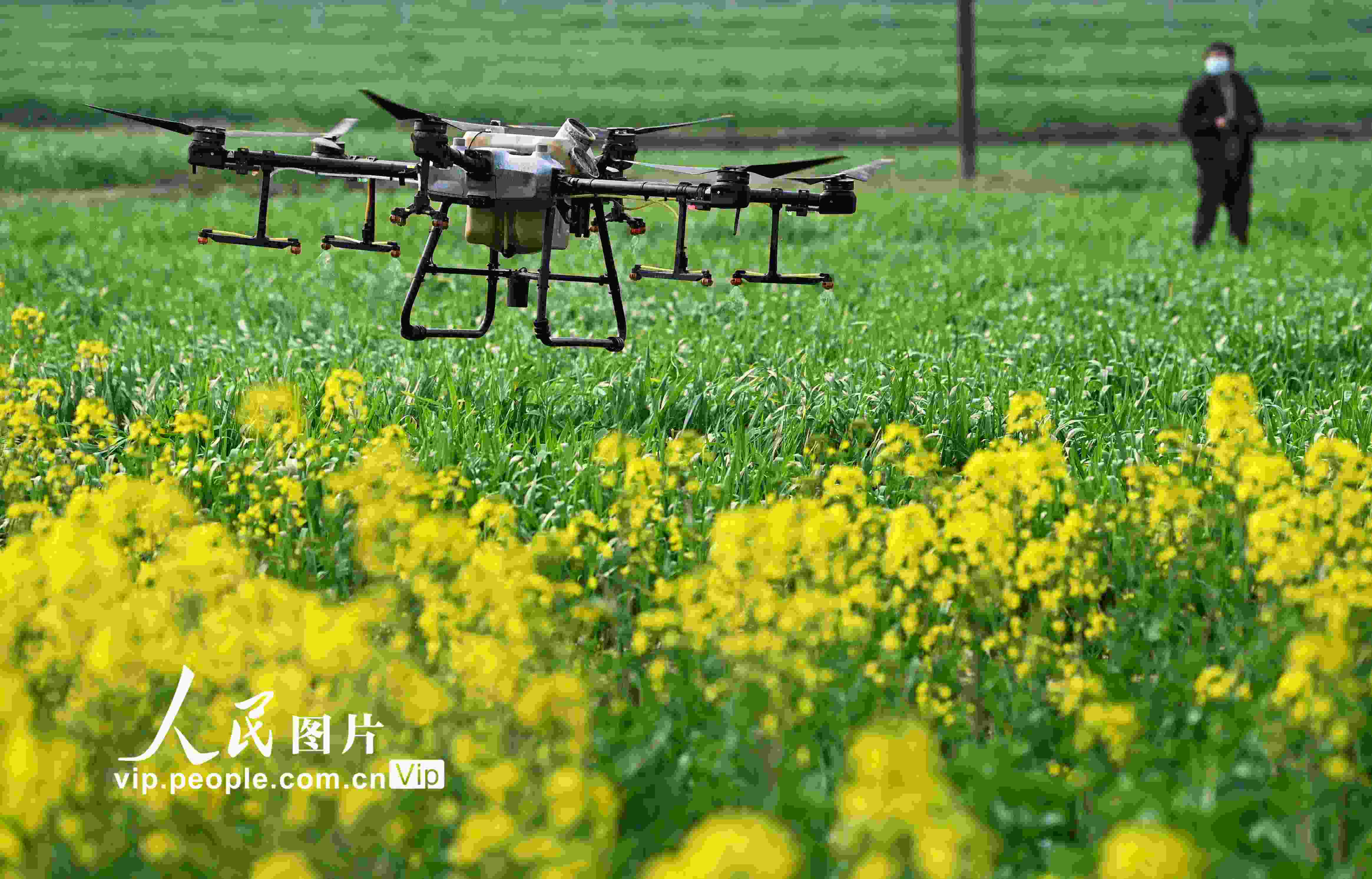 2023年2月25日,四川省南充市蓬安縣睦壩鎮(zhèn)武勝村,工作人員操控植保無(wú)人機(jī)在麥田噴灑農(nóng)藥。劉永紅攝(人民圖片網(wǎng))
