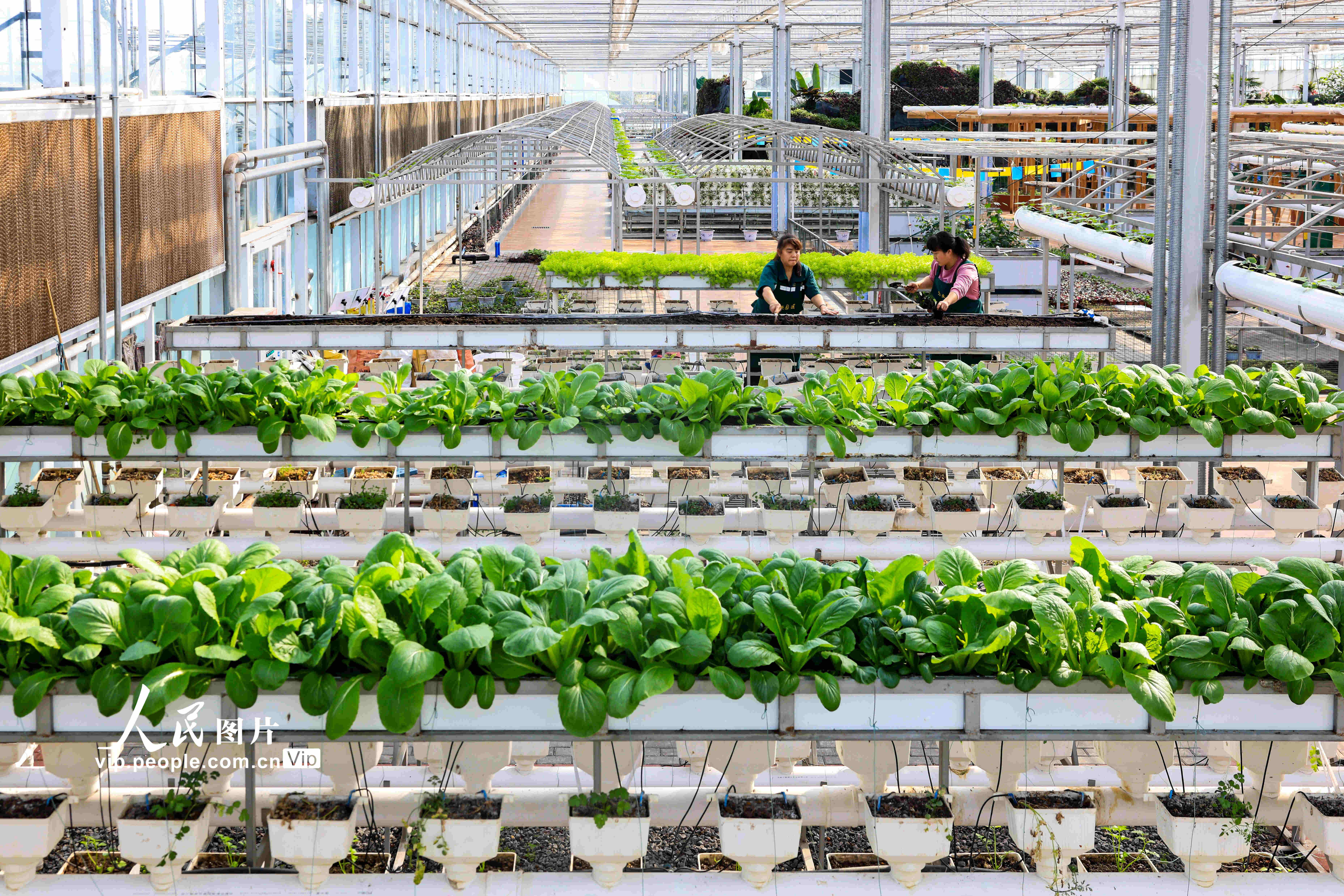 2023年2月26日,在四川省瀘州市江陽(yáng)區(qū)現(xiàn)代農(nóng)業(yè)園區(qū)的高科技溫室種植大棚內(nèi),工人們忙著養(yǎng)護(hù)栽種的蔬菜。張若涵攝(人民圖片網(wǎng))