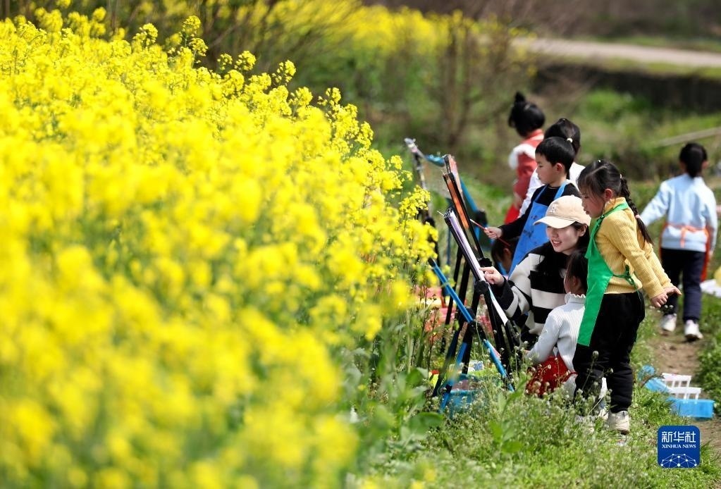 2月28日,在湖南省資興市唐洞街道高碼村,老師指導(dǎo)小朋友在油菜花田旁畫(huà)畫(huà)。
