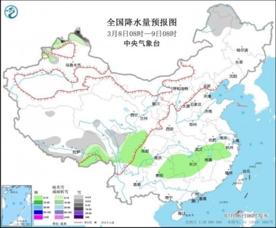3月8日08時至9日08時,新疆西北部、內(nèi)蒙古東北部、黑龍江西北部、西藏南部、川西高原北部等地部分地區(qū)有小到中雪或雨夾雪,其中,新疆西北部等地部分地區(qū)有大到暴雪(10~18毫米);西藏東南部、四川中部、貴州東部、湖南大部、江西北部等地部分地區(qū)有小雨。內(nèi)蒙古中部、遼東半島等地部分地區(qū)有4~6級風(fēng)(見圖3)。