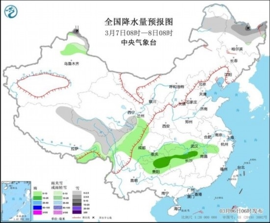 3月6日08時至7日08時,新疆西北部、西藏北部和東部、青海南部、川西高原等地部分地區(qū)有小到中雪或雨夾雪,其中,新疆西北部等地部分地區(qū)有大雪(5~7mm);新疆西北部、西藏東南部、四川南部、重慶、貴州、云南東部、湖南西北部、湖北西南部等地部分地區(qū)有小到中雨,其中,西藏東南部局地有大雨(25~30mm)。內(nèi)蒙古中部、遼寧、山東半島等地部分地區(qū)有4~6級風(fēng)(見圖1)。