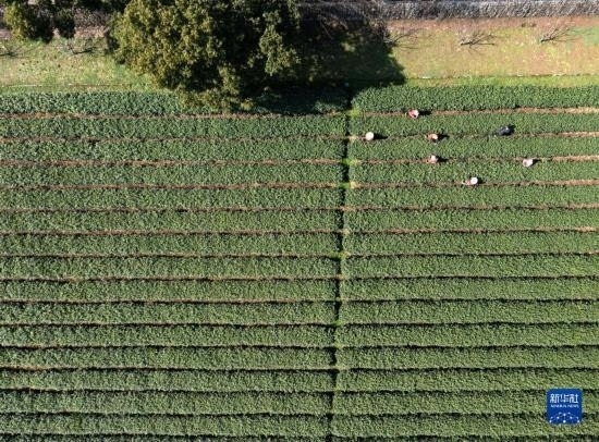 3月13日,龍井村的茶農(nóng)在采摘西湖龍井“明前茶”(無(wú)人機(jī)照片)。