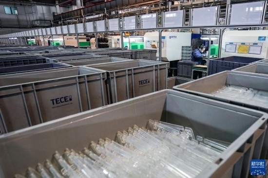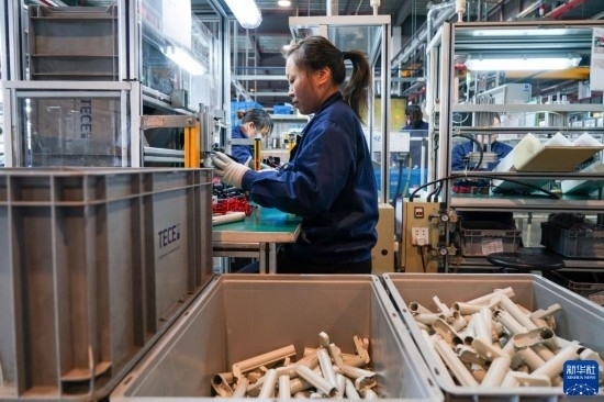 工人在位于太倉市高新區(qū)的帝希潔具系統(tǒng)(蘇州)有限公司生產(chǎn)車間內(nèi)進(jìn)行加工作業(yè)(3月16日攝)。