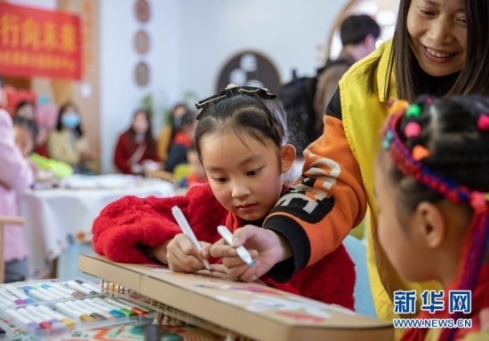 在成都市金牛區(qū)西北街社區(qū)的服務大廳一角,一群孩子正為紙板制作的各族樂器繪畫著色。