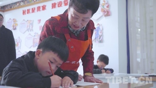 “這一筆要拉長,再拉長,對不對!”操著一口四川話的張惠英老人一邊把著孩子的手寫字,一邊微笑耐心地講解。在吉福社區(qū)的一間教室里,十來個孩子正在認(rèn)真地練寫漢字筆畫,而教他們書寫的張惠英并不是真正的教師,而是孩子們的“共享奶奶”。
