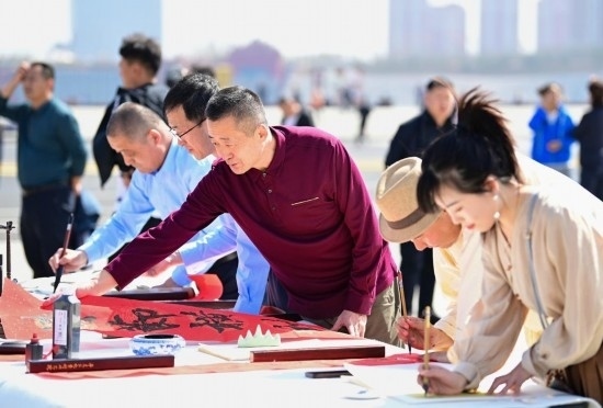 4月1日,書法愛好者在康巴什區(qū)亞洲雕塑藝術(shù)主題公園書寫詩歌作品。