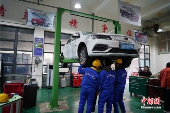 學(xué)生們正在老師指導(dǎo)下進(jìn)行汽車(chē)維護(hù)保養(yǎng)、機(jī)械故障診斷等操作。中新網(wǎng)記者 劉湃 攝