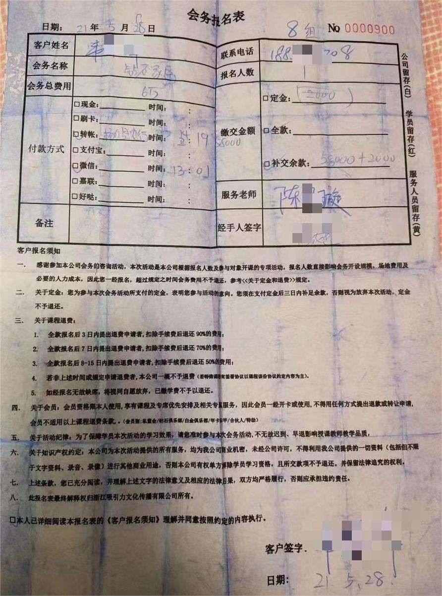 “我愿意?!边@名女學(xué)員回答后,便接過楊濤鳴給的一張“會務(wù)報名表”的單據(jù)。