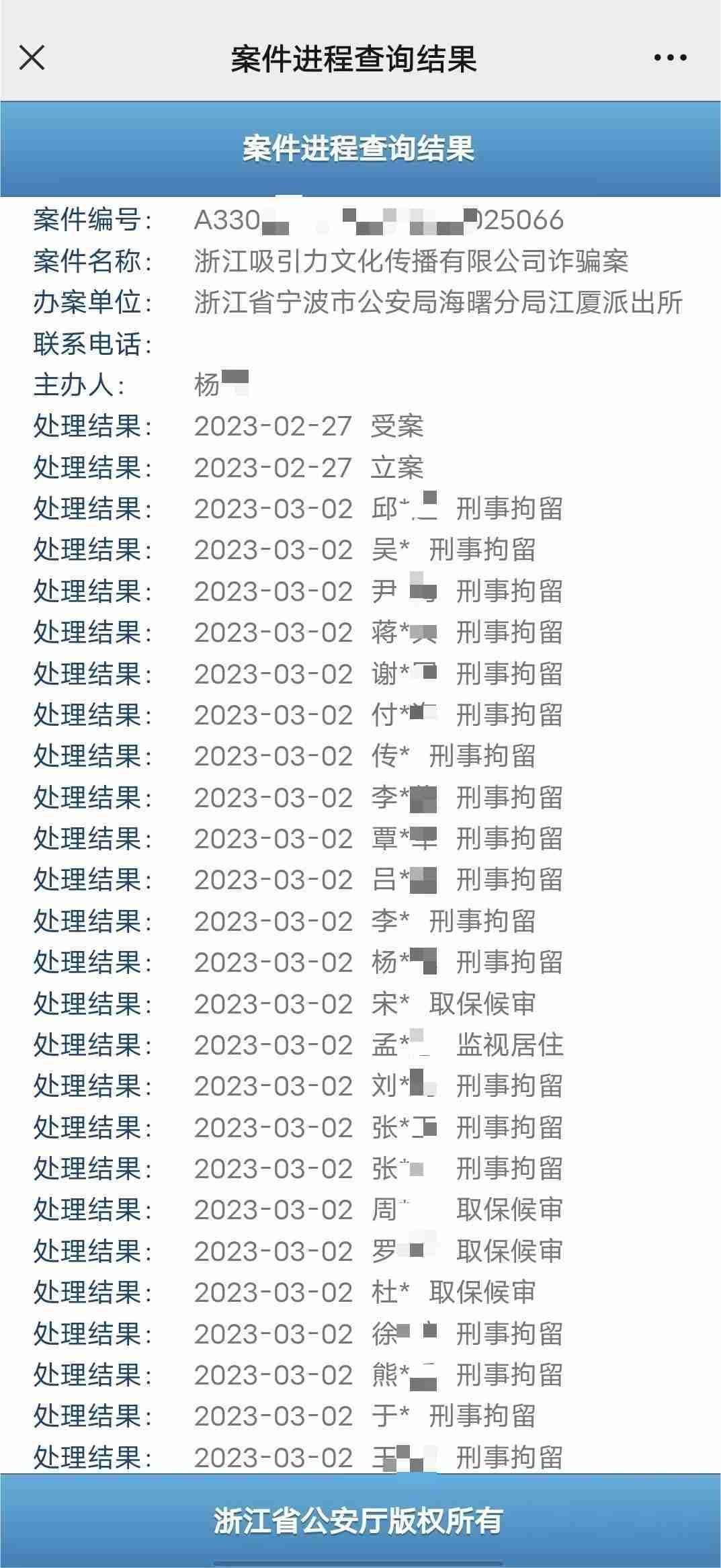 劉文軍提供的“案件進(jìn)程查詢結(jié)果”顯示,3天后,張偉玉和楊濤鳴在內(nèi)的20余人被刑事拘留,還有4人被取保候?qū)彛?人被監(jiān)視居住。