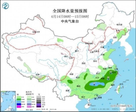全國(guó)降水量預(yù)報(bào)圖(4月13日08時(shí)-14日08時(shí))。圖片來(lái)源:中央氣象臺(tái)網(wǎng)站