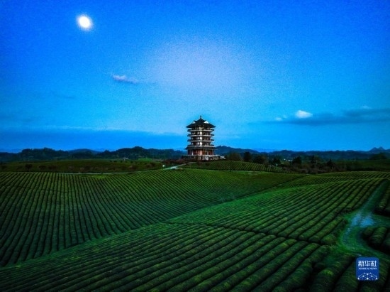 4月4日在遵義市湄潭縣永興鎮(zhèn)拍攝的月光下的“萬畝茶?!保o人機(jī)照片)。