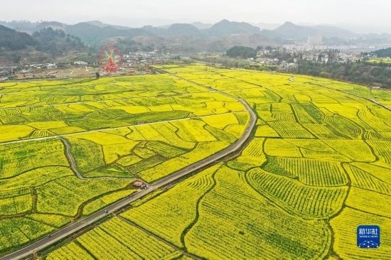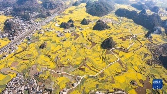貴州省六盤水市六枝特區(qū)木崗鎮(zhèn)抵簸村的油菜花田(3月9日攝,無人機(jī)照片)。