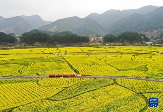 游客乘坐觀光小火車在貴州省貴定縣盤江鎮(zhèn)“金海雪山”景區(qū)觀賞油菜花海(3月12日攝,無人機(jī)照片)。