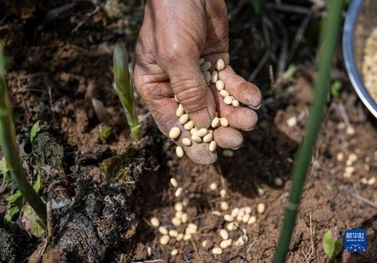 4月15日,村民在貴州省開陽縣南龍鄉(xiāng)中橋村中藥材種植基地套種黃豆。