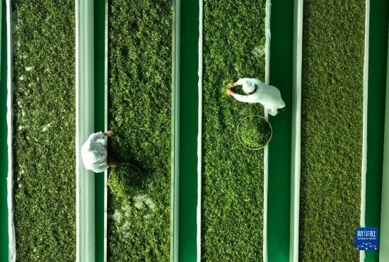 4月15日,在貴州省開陽縣南龍鄉(xiāng)翁朵村一茶葉加工廠,工人在攤晾茶青(無人機照片)。