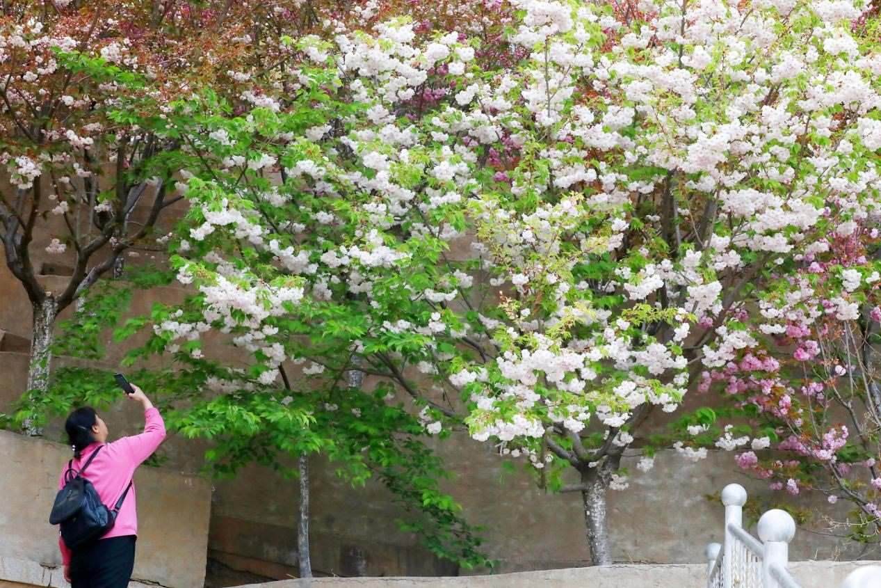 櫻花園里,各類櫻花搖曳生姿,爭相怒放,景色宜人,構(gòu)成一幅幅明麗的春日畫圖。前來觀賞的游客紛紛在櫻花樹下拍照打卡。